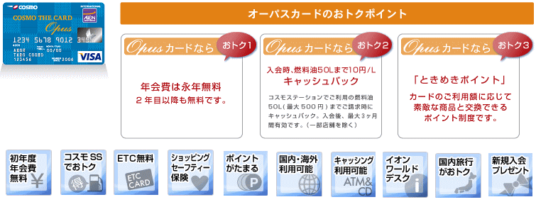 石油会社のクレジットカードは数種類あります。人気があるのは年会費が永久無料のコスモザカードオーパスです。コスモザカードオーパスは、会員価格でガソリンが給油でき、全国のコスモステーションで使用できます。ガソリンを給油する時やイオン加盟店で使用した場合にポイントも付きます。